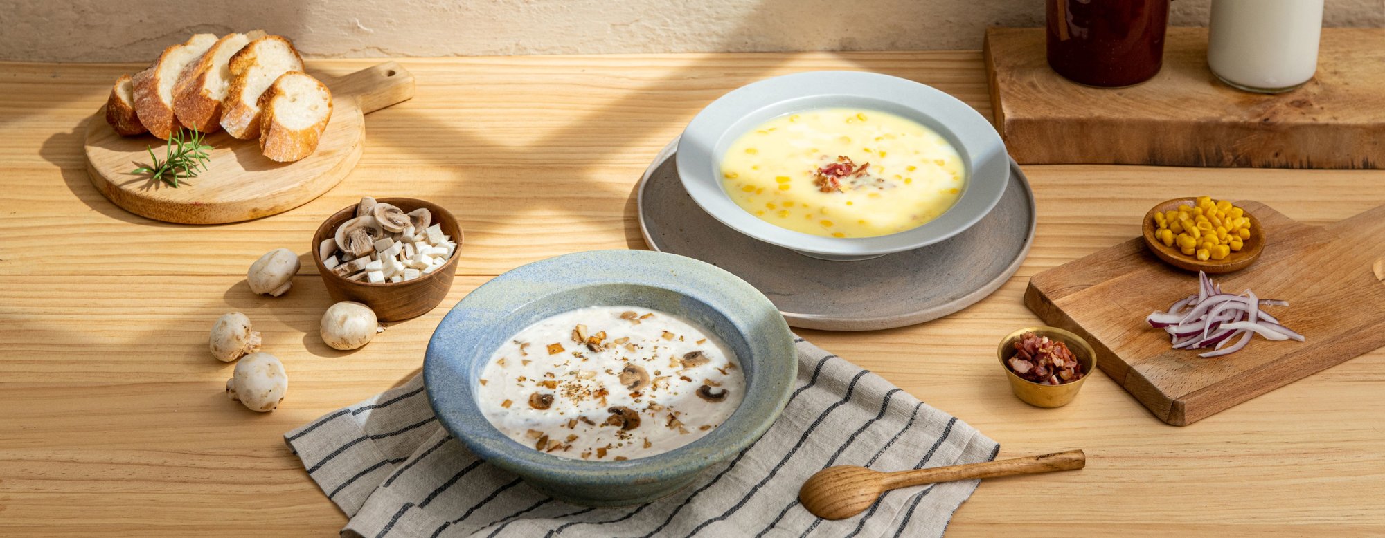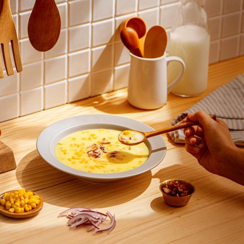 嚴選顆粒飽滿的甜玉米粒,乾燥研磨成粉後仍保留玉米自然甘甜的風味,搭配頂級奶油乾酪製成香醇滑順的濃郁湯底,並以巴西里葉提味,更添加金黃玉米顆粒及培根豐富口感,每吃一口都是天然香甜的幸福享受!