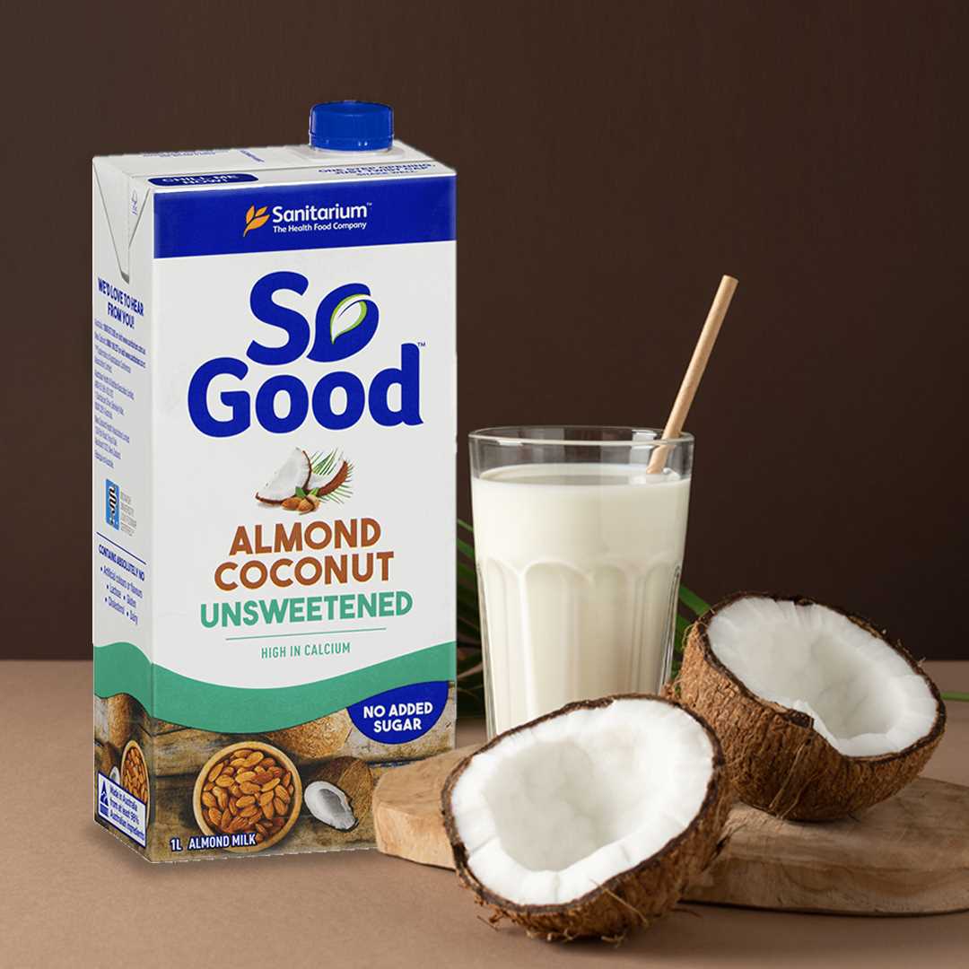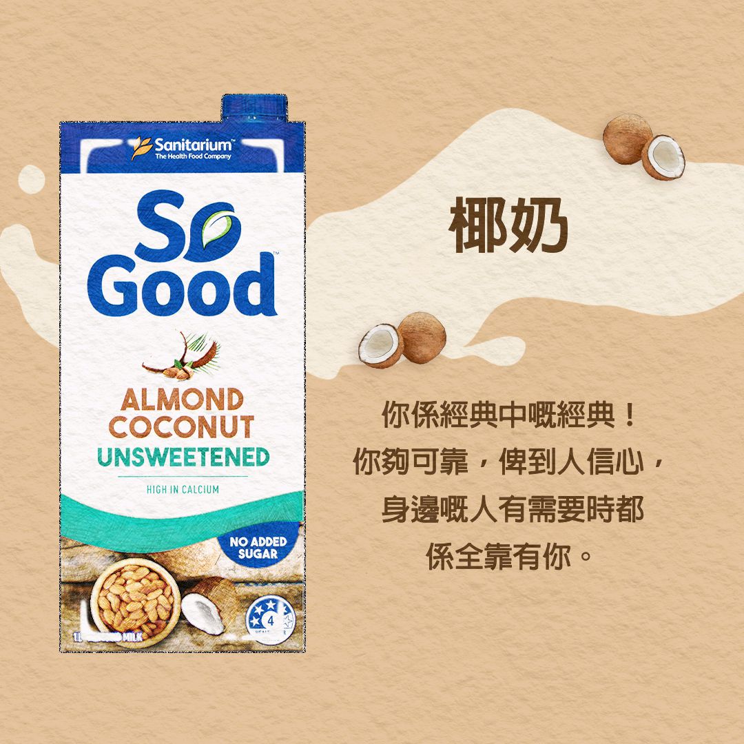 So Good™ 無糖椰子杏仁奶將杏仁的溫和堅果味與椰子的清爽味道混合在一起,天然不含乳糖、麩質、乳製品和膽固醇,飽和脂肪含量