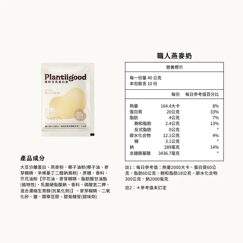 嚴選天然燕麥粉,融合美國 Solae 職人級大豆蛋白,打造如燕麥奶般溫潤柔和的風味基底