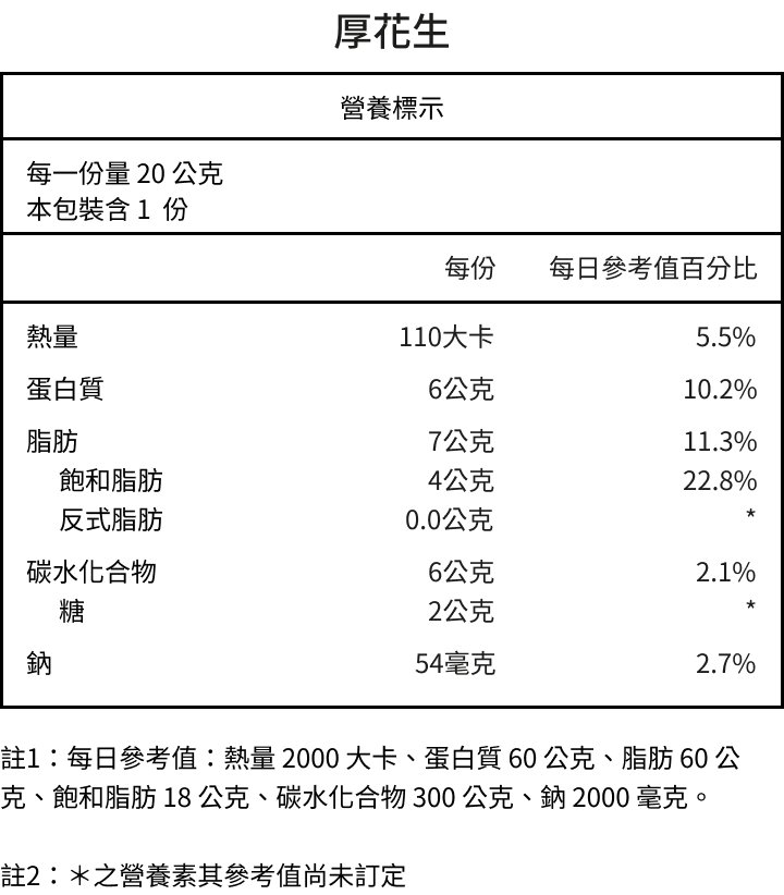 過敏原:本產品含有麩質(小麥)、奶製品、花生及大豆。本產品製造廠房,其設備有處理芝麻及其製品、堅果種子及其製品,對其過敏者請留意